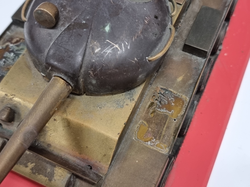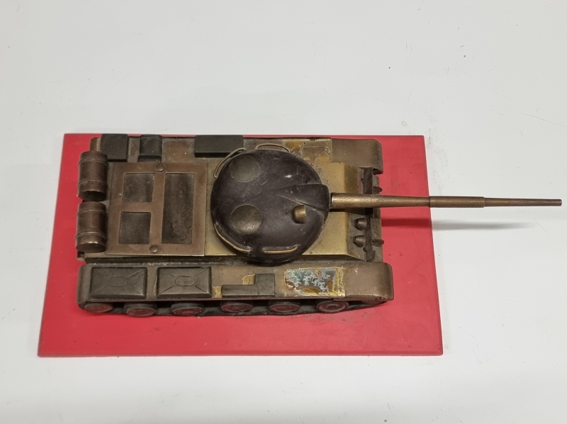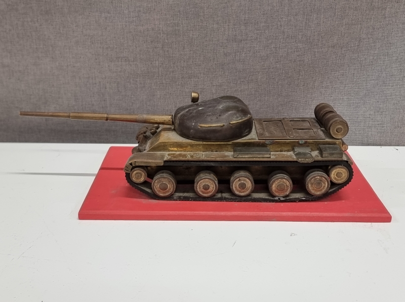 #1740 - Metallinen panssarivaunu puulevyllä. Tankin pituus 32cm.