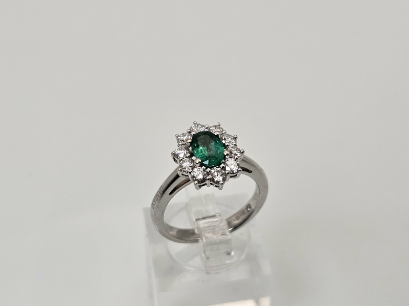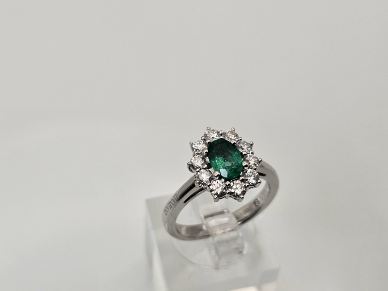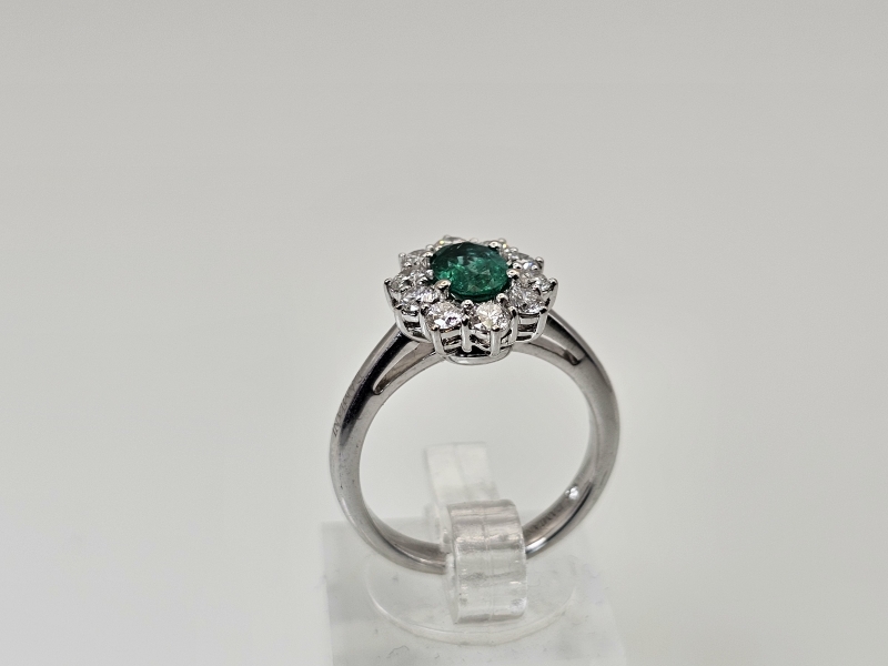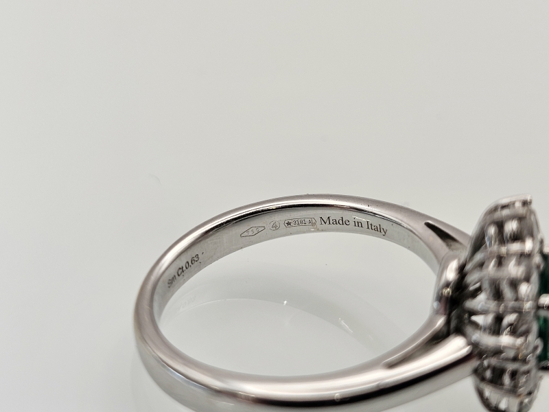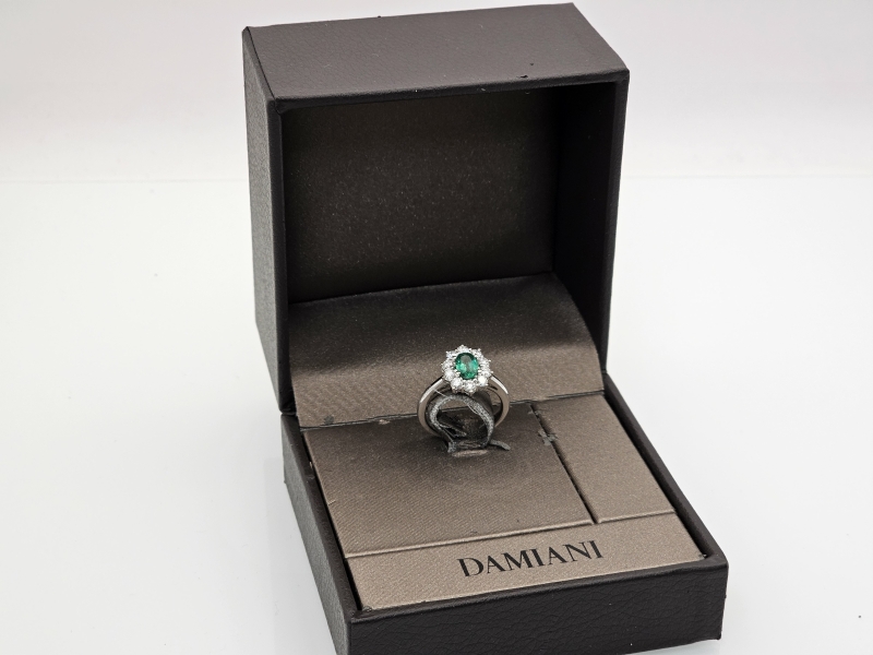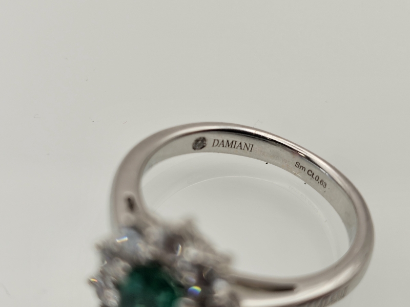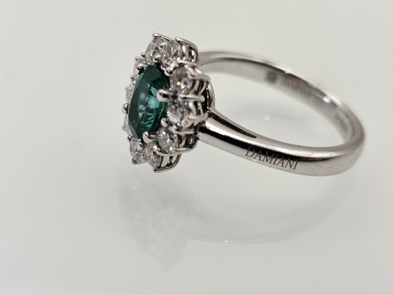#1024 18k valkokultainen laadukas italialainen Damiani sormus n. 0,50ct smaragdilla ja timanteilla [yht. 0,63ct VS-SI1], 5,55g
