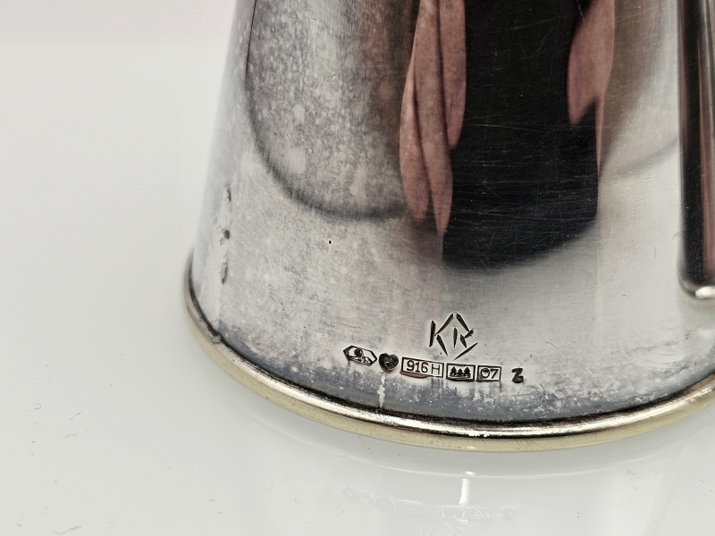 Bruttopaino 522g. Pohjassa kaiverrukset. 916/1000 hopeaa. K: 21cm