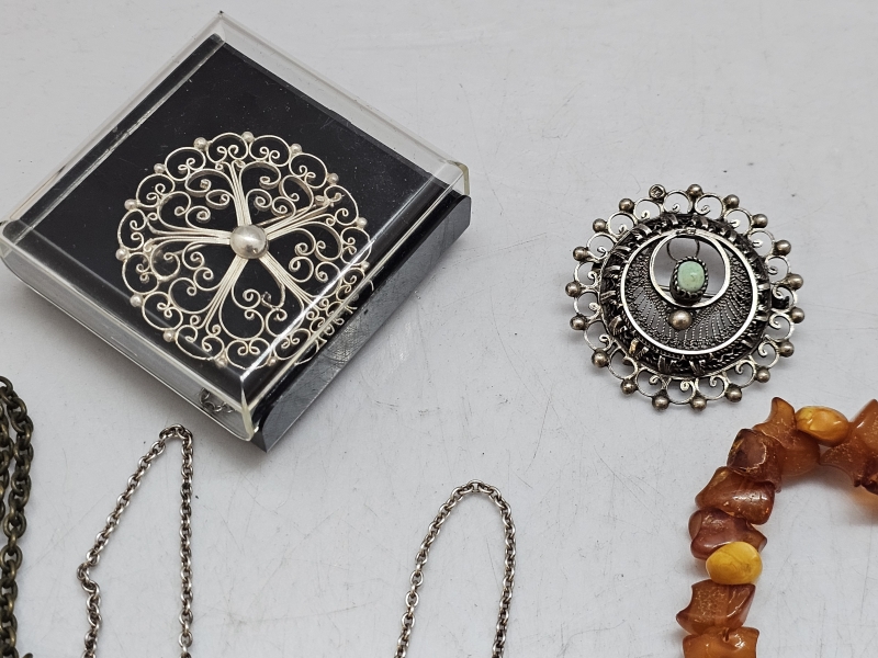 #1471 Erä koruja: Mm. meripihkaa, hopeaa [mm. Kalevala koru]