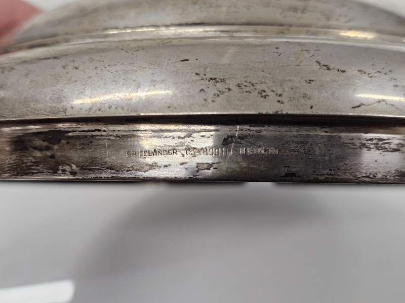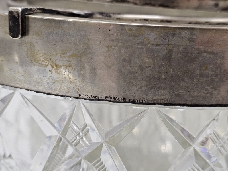 Halkaisija 34,5cm, keskimaljan k: 24cm. Ilman keskiosaa voi käyttää shampanjacoolerina, keskiosan kanssa jäitä ympärille ja kaviaarit/jäätelöt keskimmäiseen maljaan. Kannen ja väliosan paino 650g + reunan hopeat [yhteensä reilusti yli 1kg!]. Pitoisuus 800/1000. Friedländer toimi Preussin ja Saksan keisarillisen hovin hovihankkijana