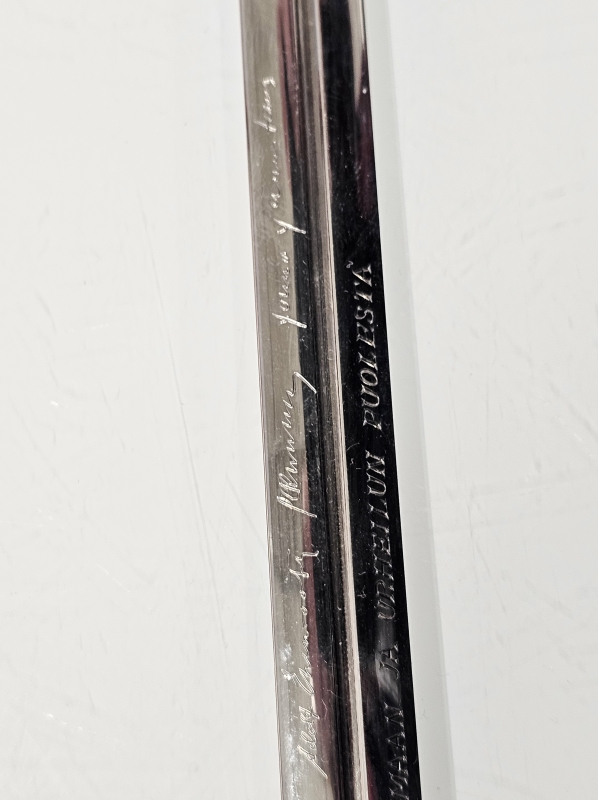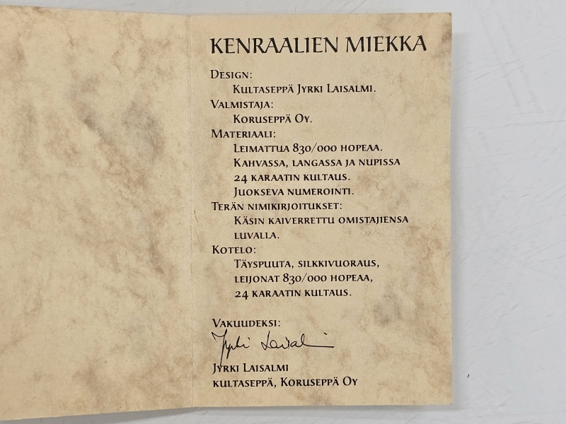 Miekassa kenraalien signeeraukset. Miekan paino 253g, pit: 40cm. Hienossa säilytysrasiassa jossa Suomi-leijonat. Nro. 30/100, valmistaja Jyrki Laisalmi