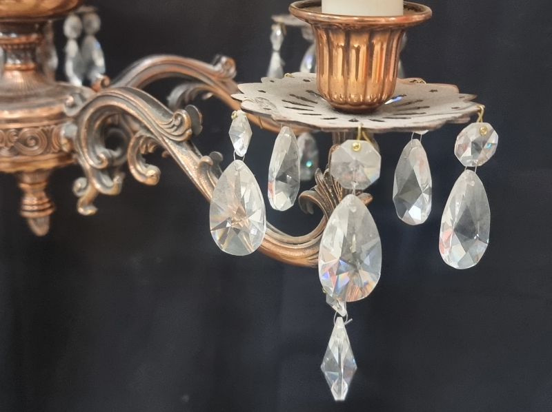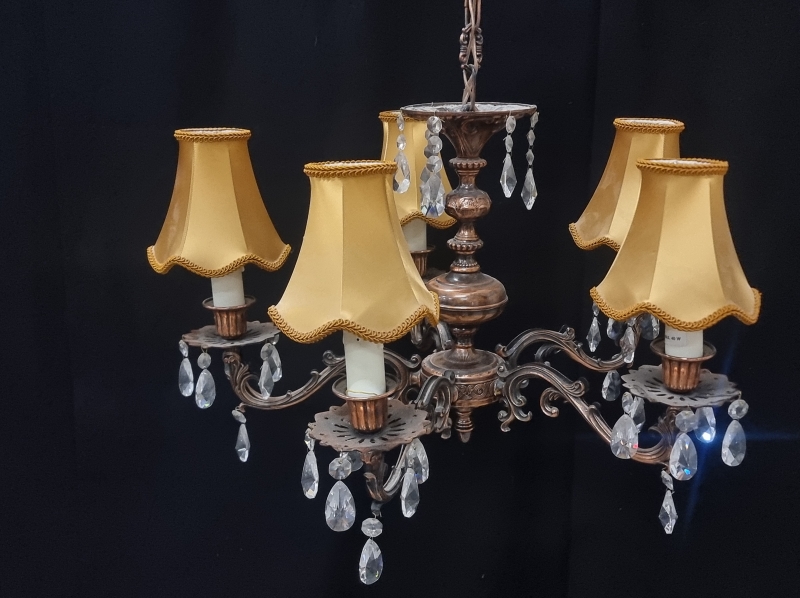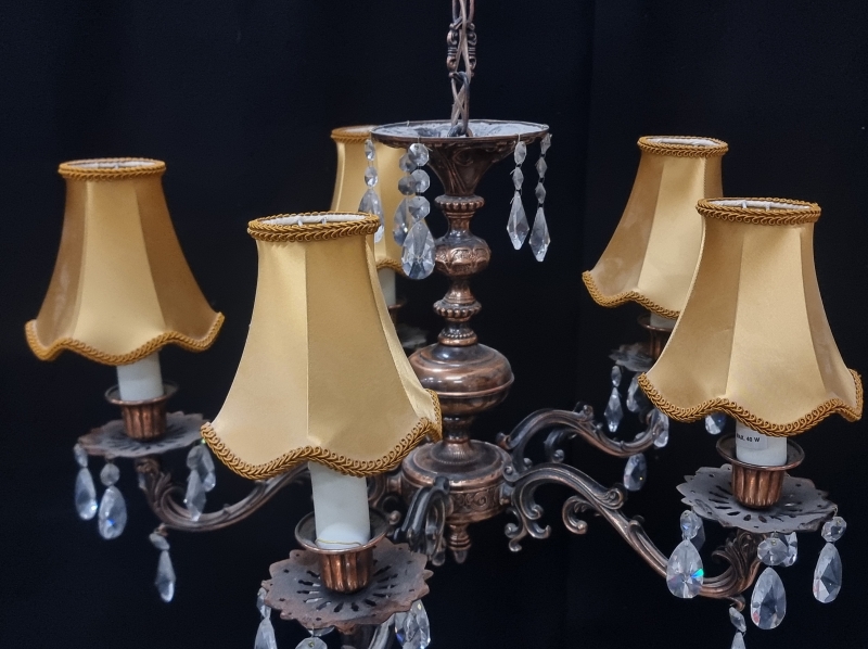 #2398 - Metallirunkoinen kattovalaisin kristalleilla ja kangasvarjostimilla.