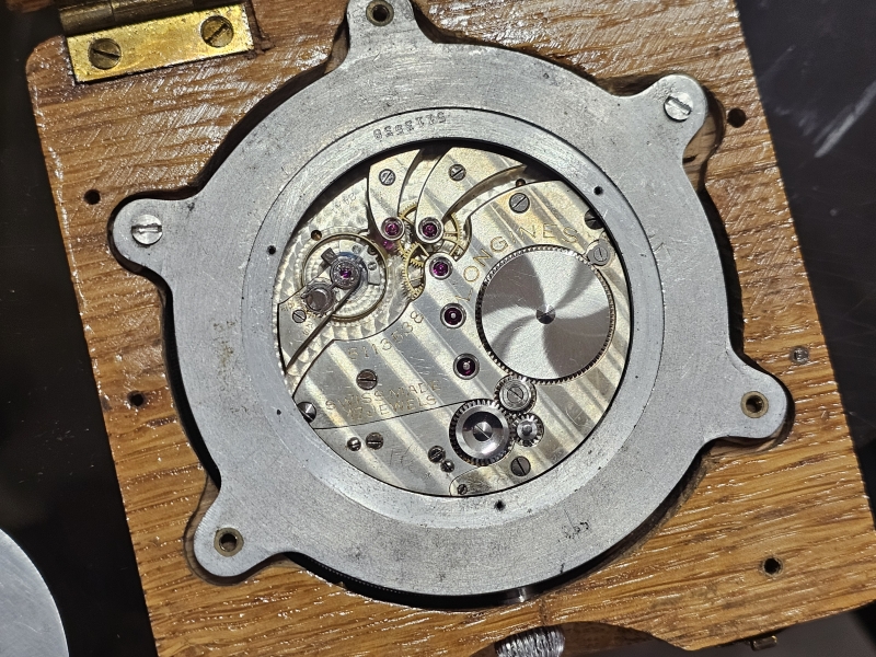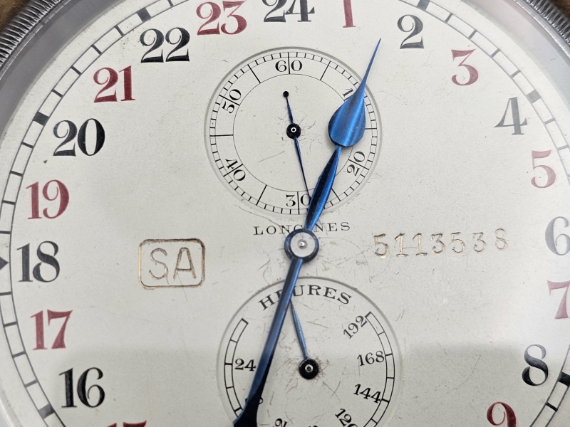 #1480 Harvinainen Longines "lentäjänkello" SA -leimalla ja 24h näytöllä, puulaatikossa, vuodelta 1932