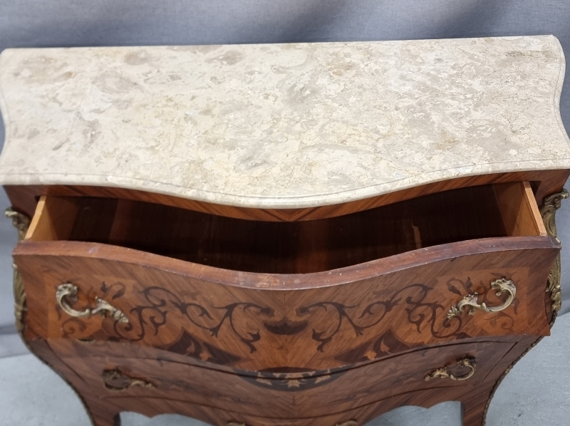 #1820 - Kivikantinen mahalipasto runsailla intarsiaupotteilla ja messinkilyötteillä.