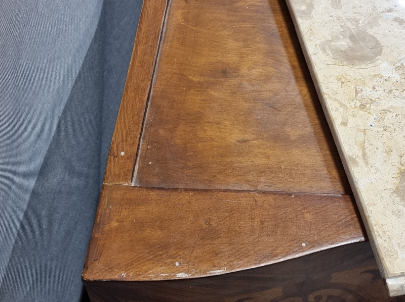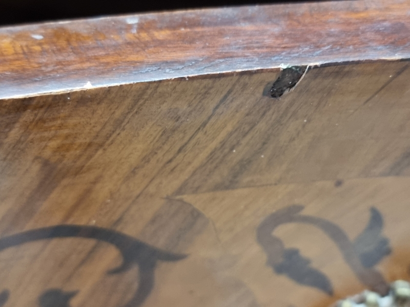 #1820 Kivikantinen mahalipasto runsailla intarsiaupotteilla ja messinkilyötteillä.