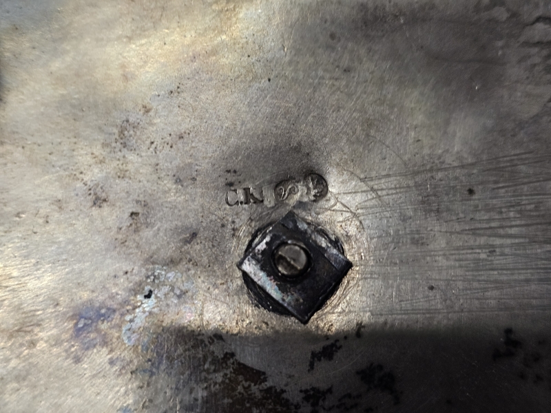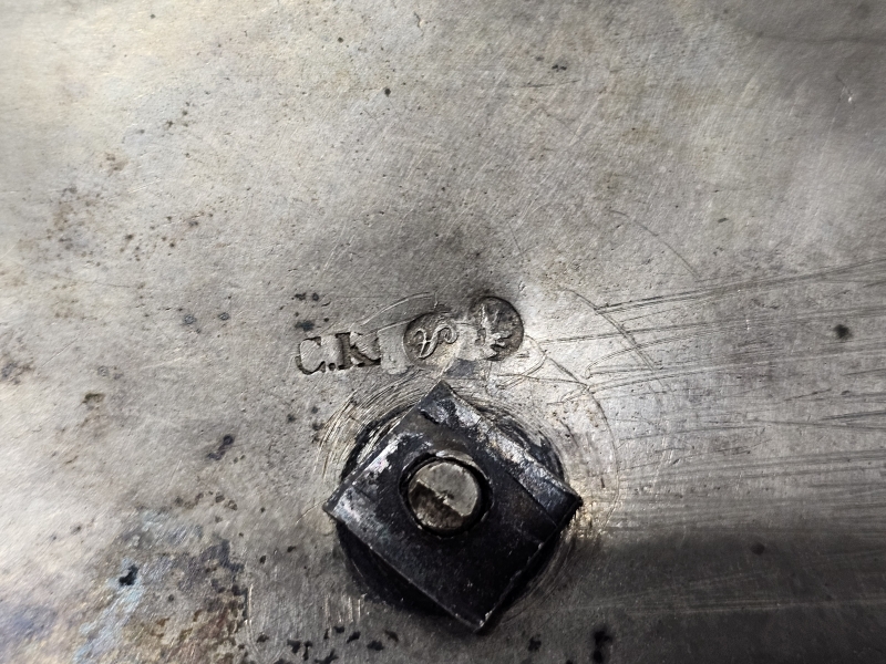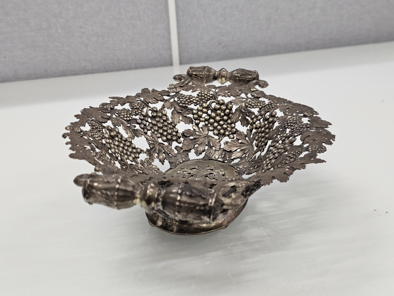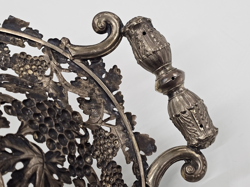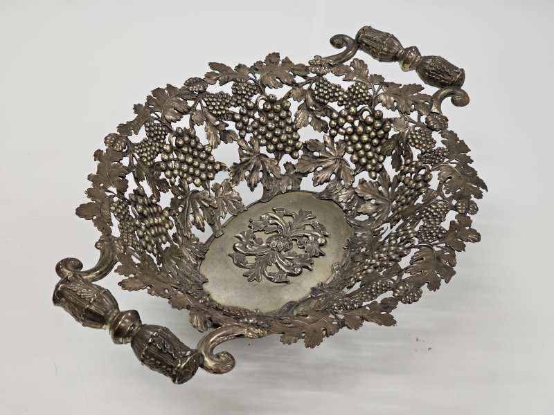 Paino 395g. Epäselvät leimat, testattu XRF-laitteella noin 830/1000 hopeaksi. P: 36cm