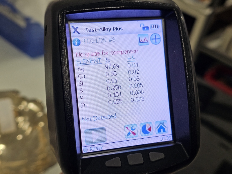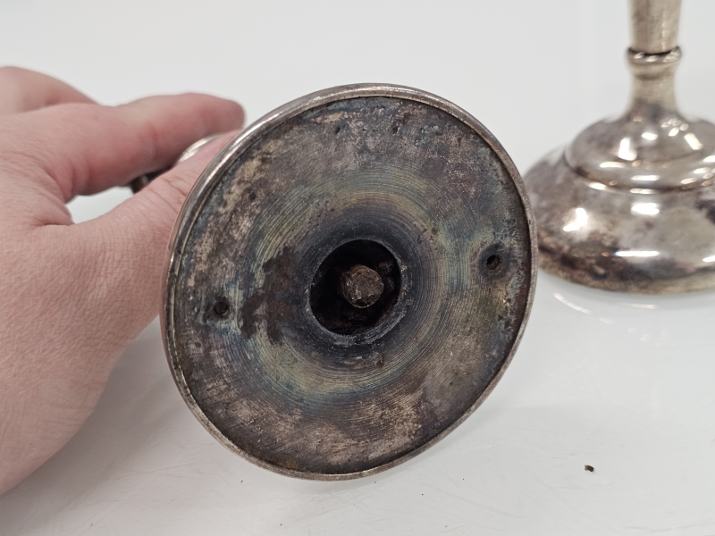 Ei leimoja, testattu XRF-laitteella hopeaksi. K: 14,5cm. Toinen holkki puuttuu. Bruttopaino 412g