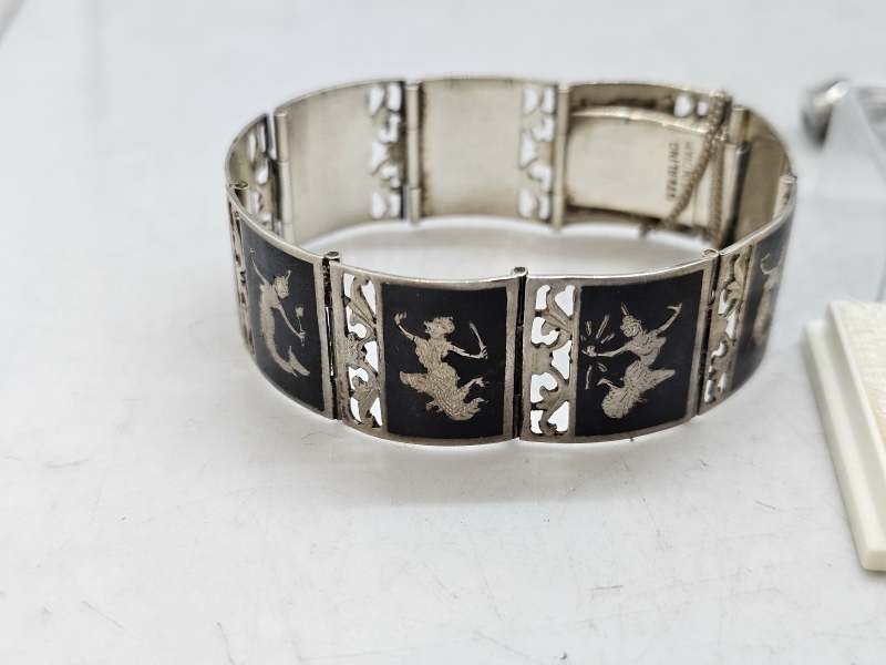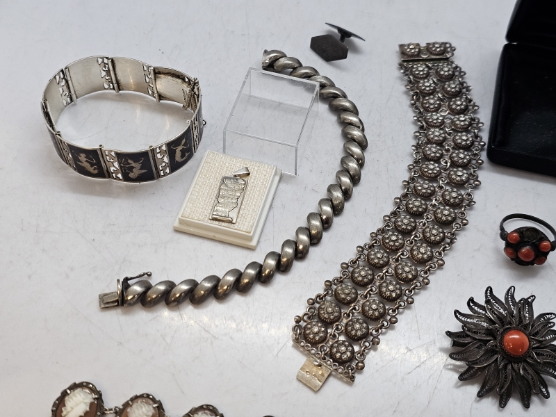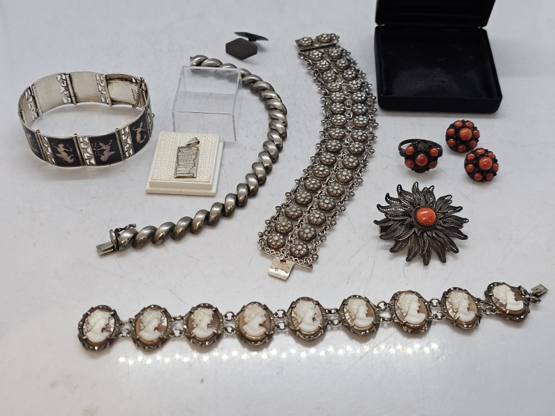 #1591 Erä hopeakoruja: Mm. niellokoristelu, camee rannekoru ym.