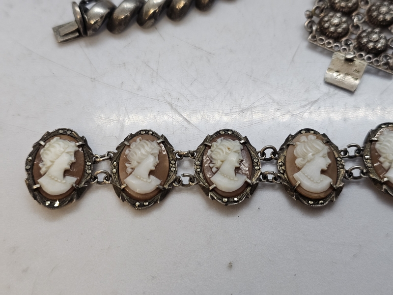 #1591 - Erä hopeakoruja: Mm. niellokoristelu, camee rannekoru ym.