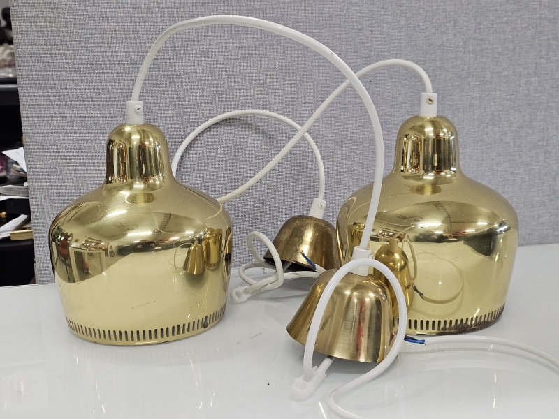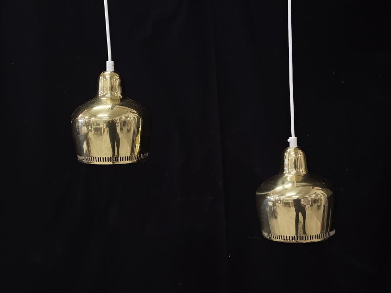 #860 2kpl Alvar Aalto A330S "Kultakello" kattovalaisimia, valmistaja Louis Poulsen 1950-60 -luvulla