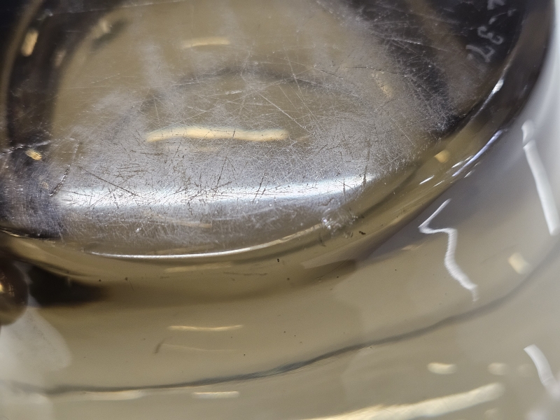 Signeerattu -37. Pohjassa kaksi pientä kolhua. K:19,7cm, noin 27cm x 26cm. Mukana kuvissa XRF-laitteen mittaustulos = lyijyä 45%