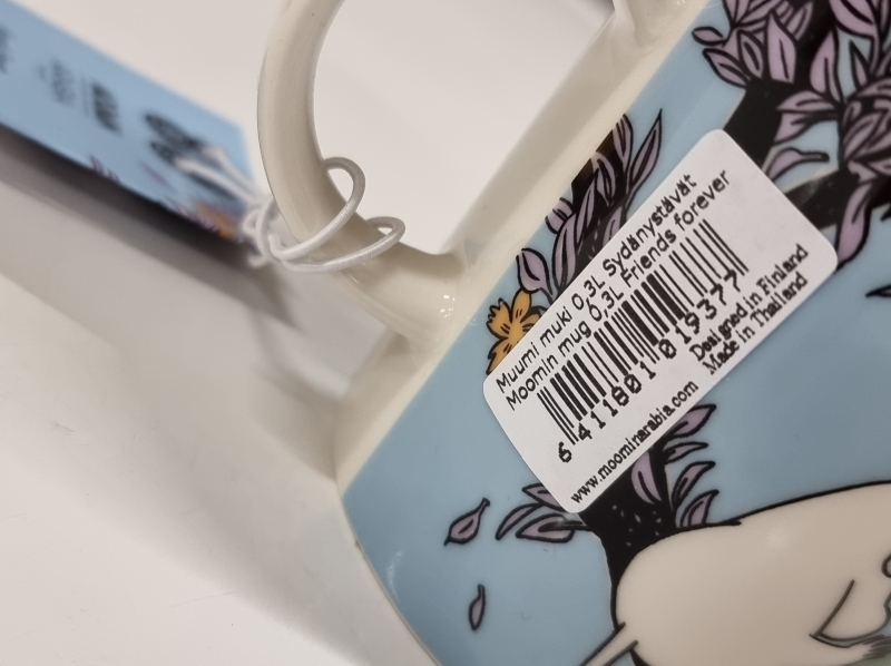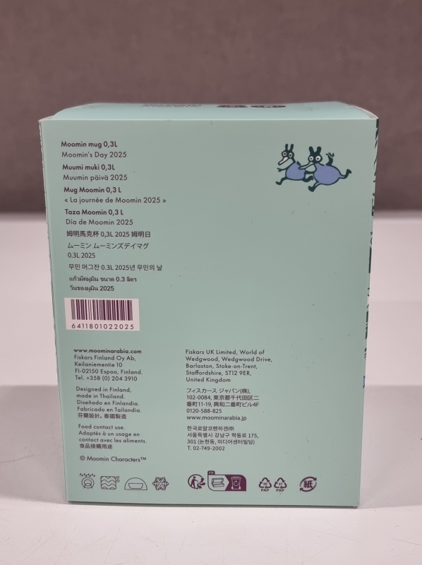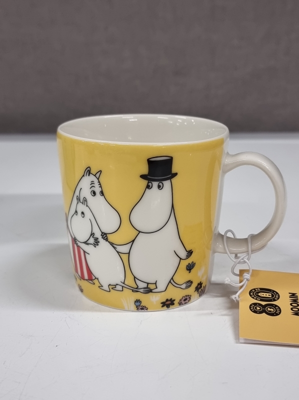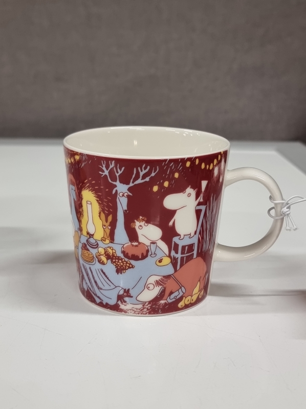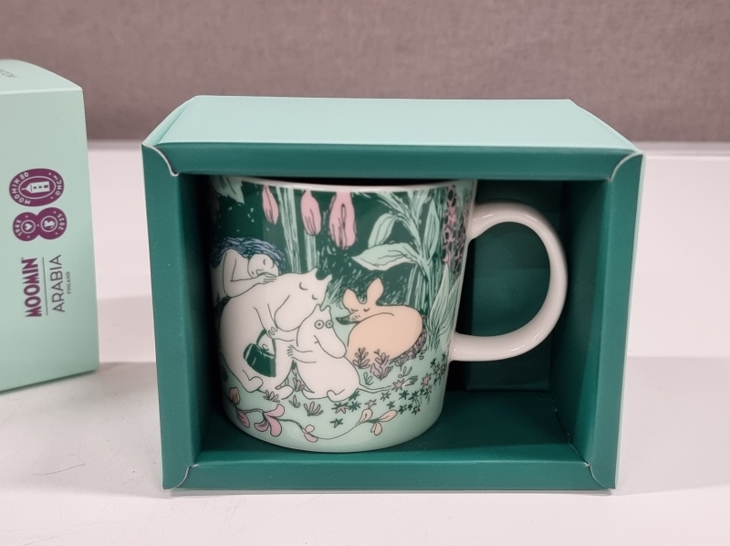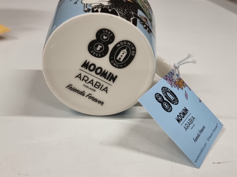 #734 - 4kpl Muumimukeja, yhdessä paketti mukana,"Muuminpäivä 2025" ja "Sydänystävät"