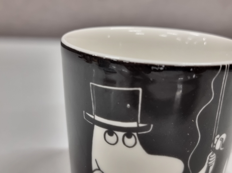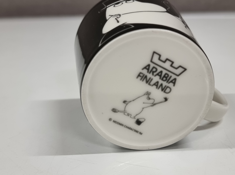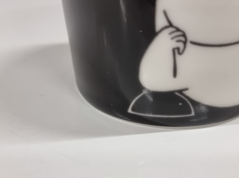 "Muumipeikko tuumiskelee" mukin lasitteessa valkoisia pisteitä kork. 8cm