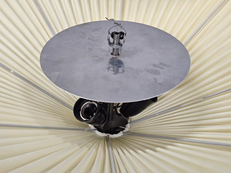 Halkaisija n. 70,5cm. Kattokiinnike puutteellinen mutta toimiva