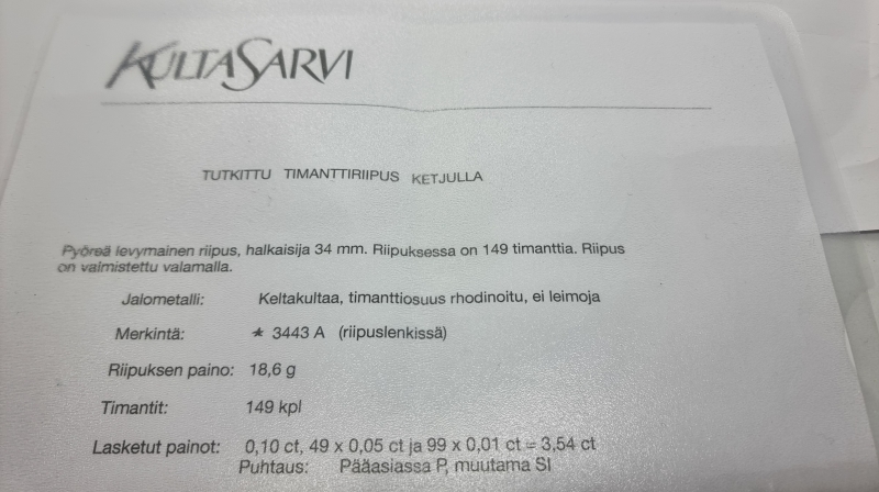 Halkaisija 35,5mm. Mukana kuva kadonneesta aitoustodistuksesta. Bruttopaino 18,67g. Yksi timantti irti mutta mukana