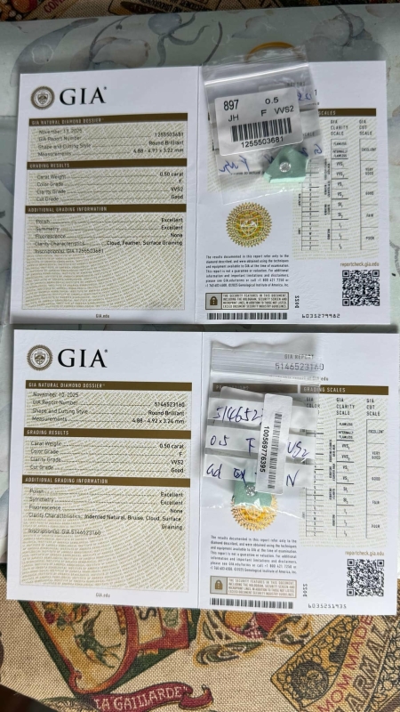 Mukana GIA -aitoustodistukset molempiin. Laserilla merkitty.
