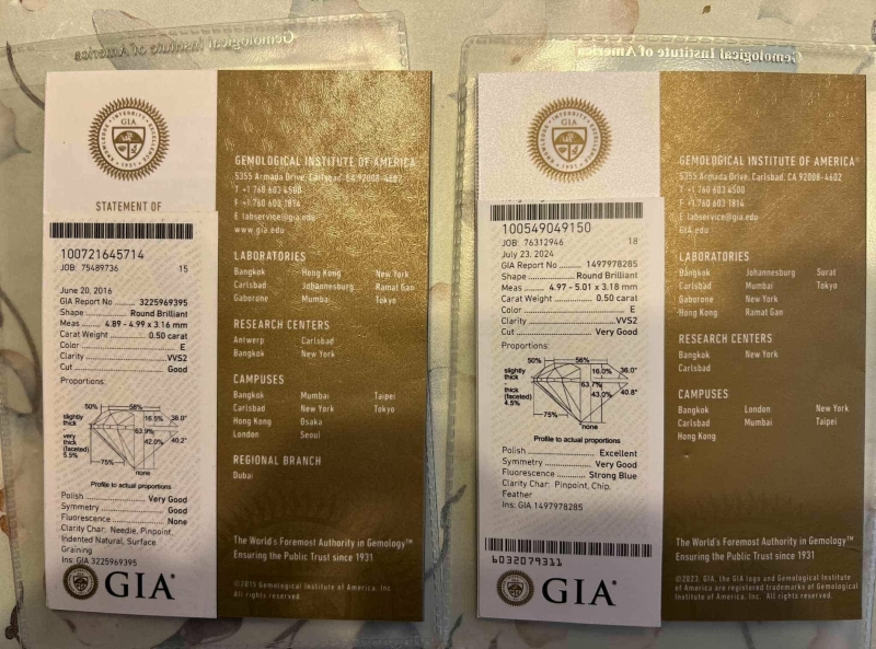 Bruttopaino 0,7g. Mukana GIA -todistukset timanteille. Laserilla merkitty.