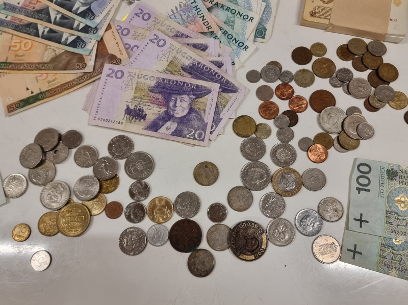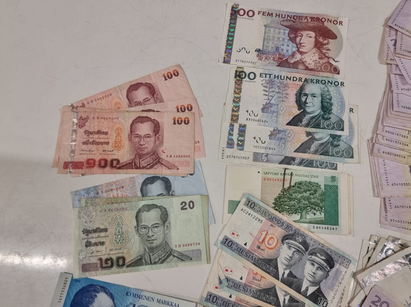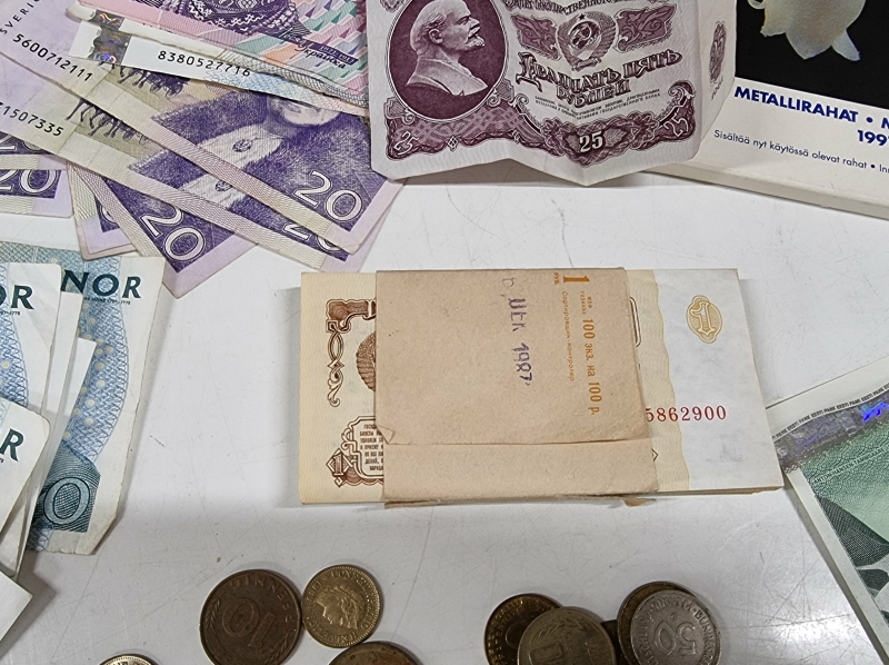 #2005 - Iso erä seteleitä ja kolikoita. Mm. Ruotsi 500 kruunua, Paavo Nurmi 10mk 1986 vuoden seteleitä