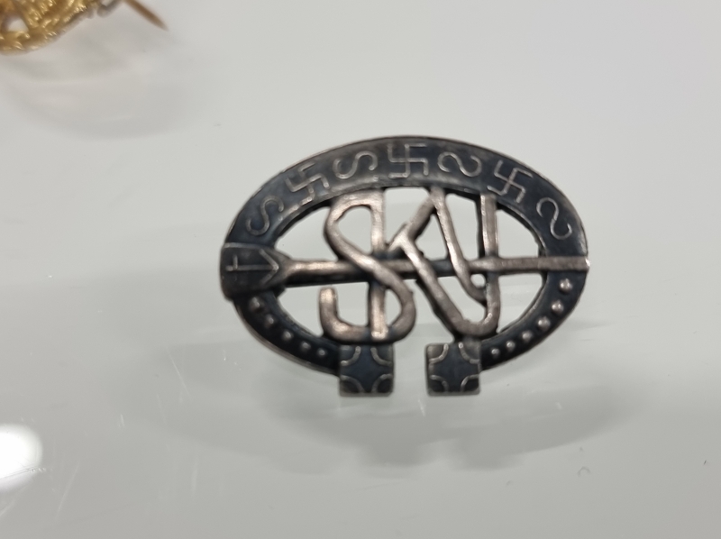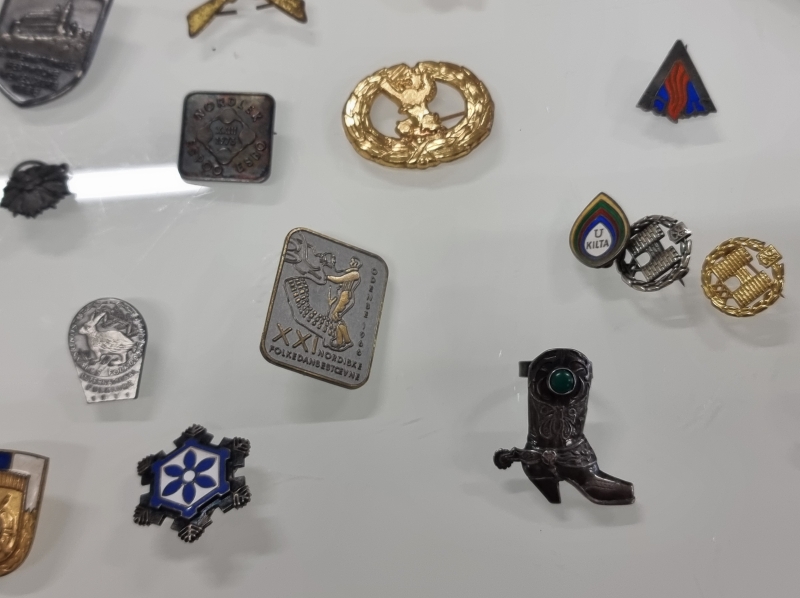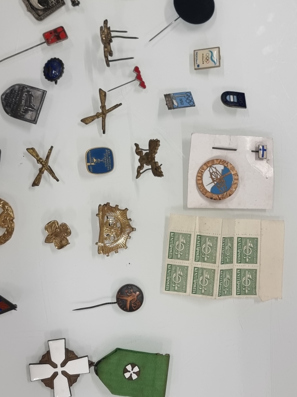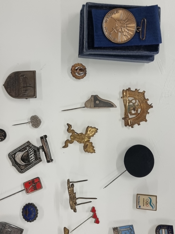 #1650 Erä merkkejä ja mitaleita, mm. Suomalaisen Kansantanssin Ystävät ry ja 1952 Olympia, osa hopeaa