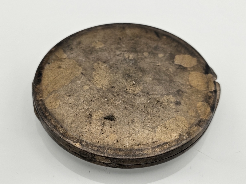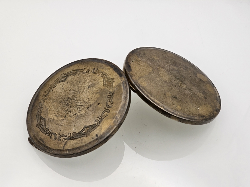 Bruttopaino 67g. Sisällä oleva peili rikki. Kaiverrus