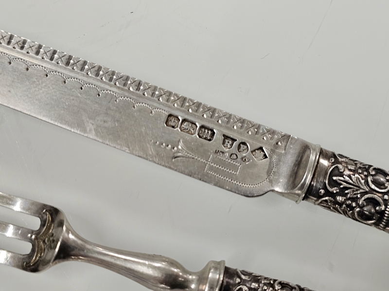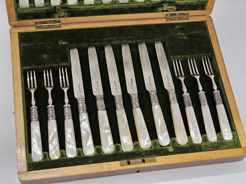 #1130 Todella hieno hopeinen aterinsarja helmiäiskahvoilla, R F Mosley & Co, Sheffield v.1904, 750g