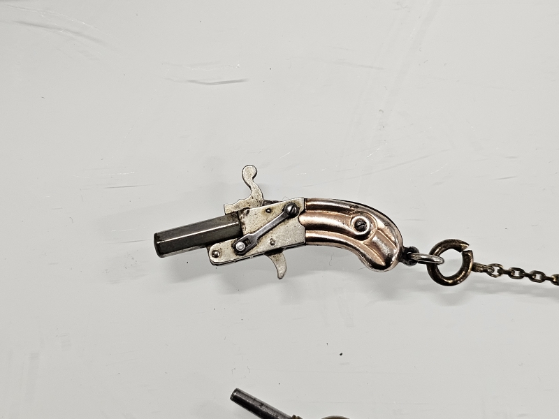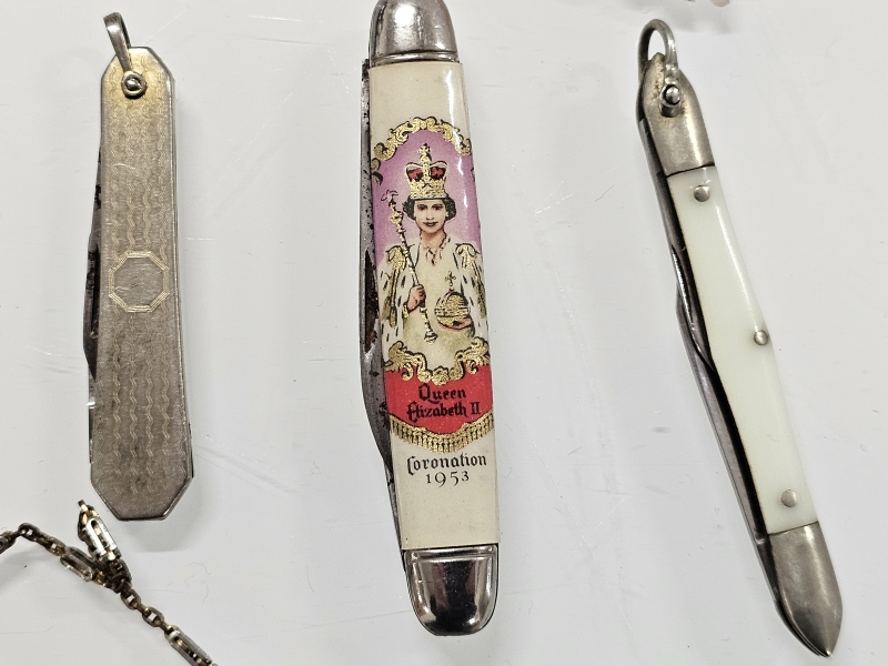 #1149 Erä tavaraa: Mm. minipistooli toimivalla mekanismilla, Coronation 1953 linkkuveitsi