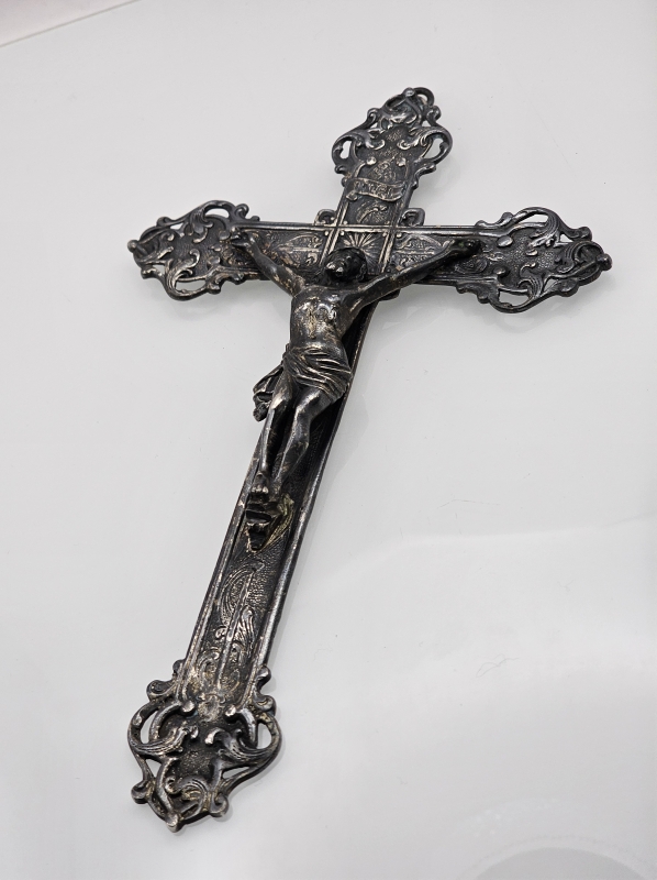 #1173 - Hopeinen krusifiksi seinäripustimella, 830h, 113g