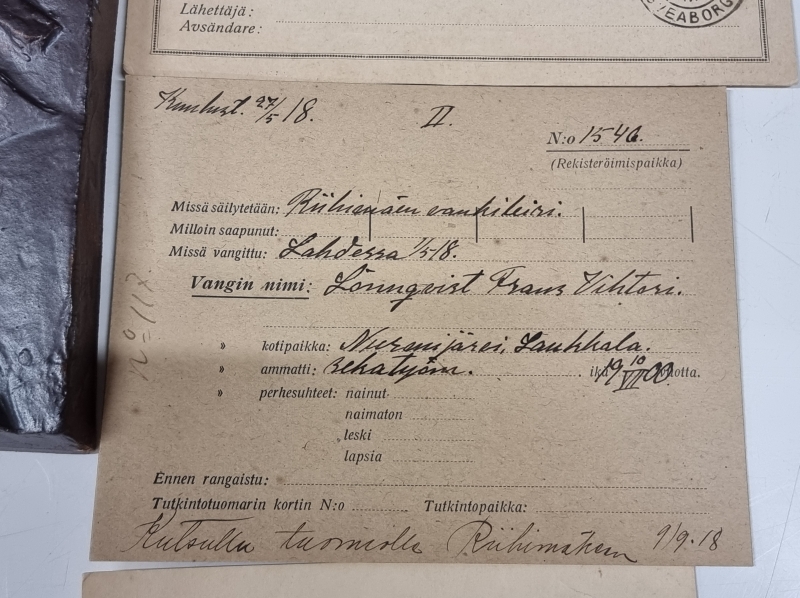 #1663 - Punakaartin esineitä: "Tulivuori"-, kahle-, työväen järjestyskaartin merkki, reliefi ym.