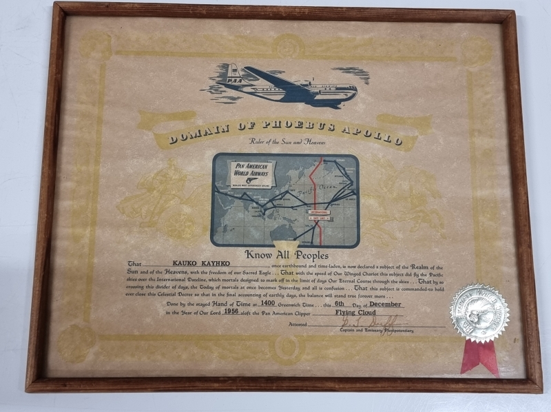 #2084 2kpl kehystettyjä Pan American Airways todistuksia lentokoneessa syntymisen johdosta.