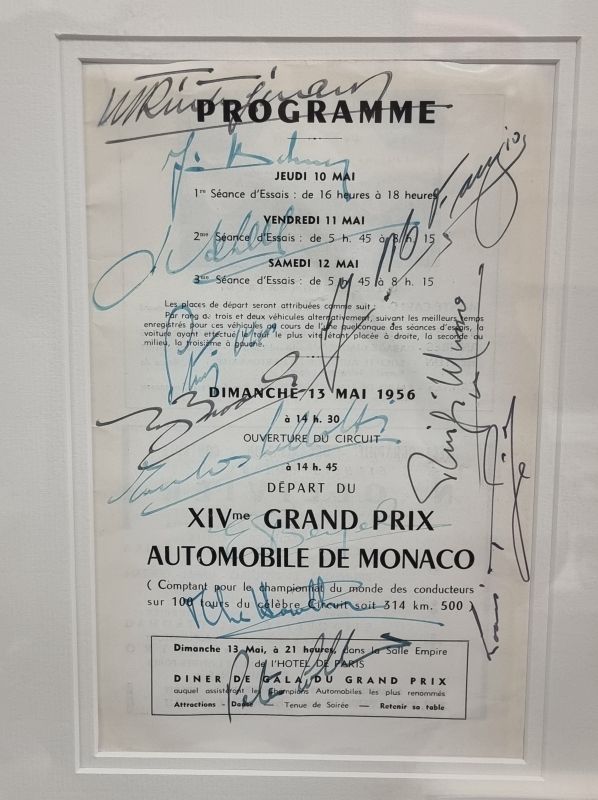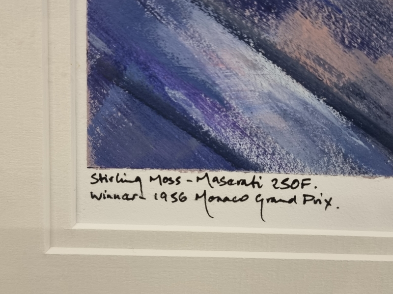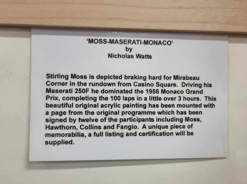 #804 Nicholas Watts signeerattu akryylimaalaus + 1956 Monacon GP käsiohjelma kuljettajien nimikirjoituksilla: Juan Fangio, Stirling Moss ym.