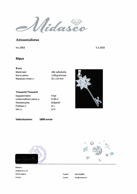 Mukana aitoustodistus sekä uusi korurasia. Puhdistettu ja kiillotettu. Riipus ilman ketjua. Bruttopaino 1,48g.