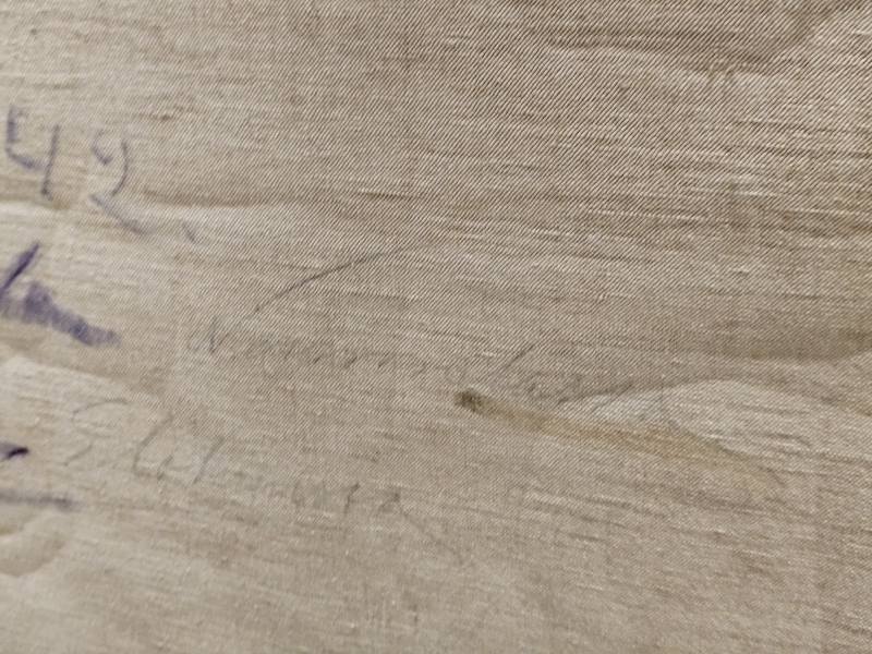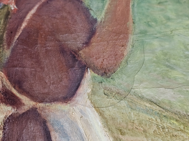 Maalissa joitakin halkeamia ja kulumaa. Kehyksineen 133,5cm x 164cm