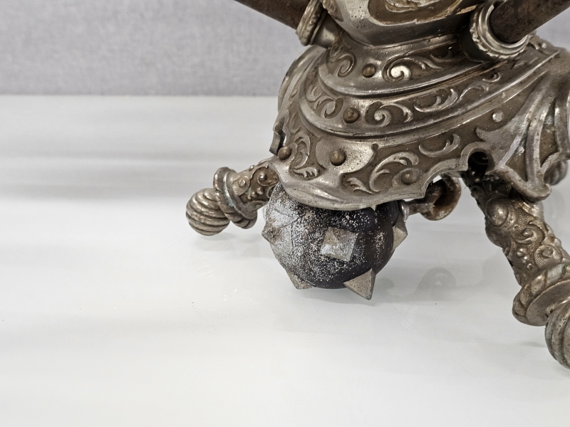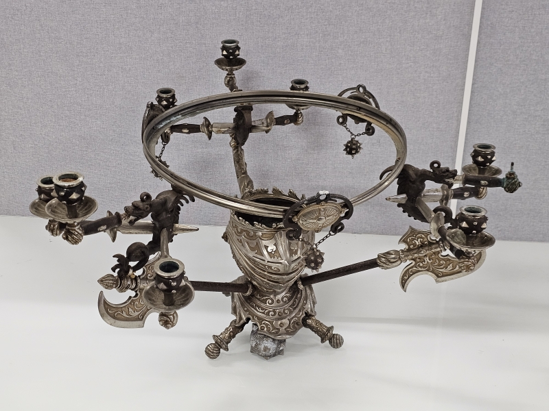 #1851 - Erikoinen metallinen ritariaiheinen pöytäteline kynttiläpaikoilla