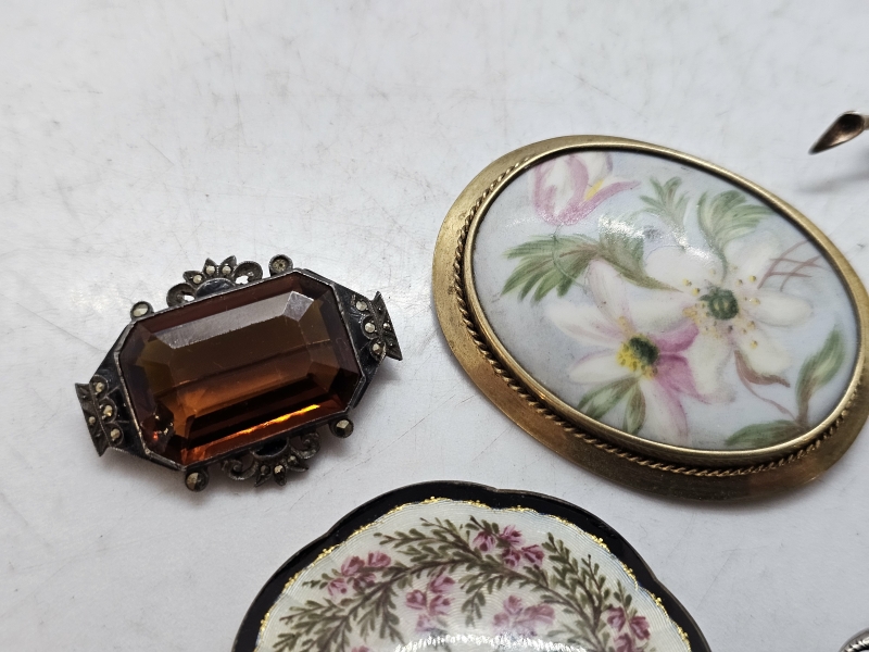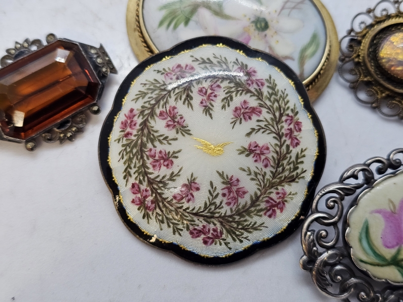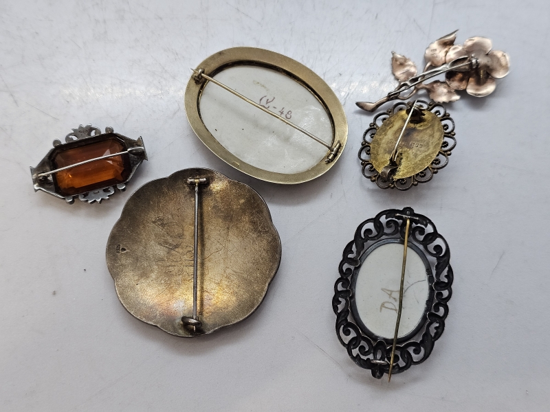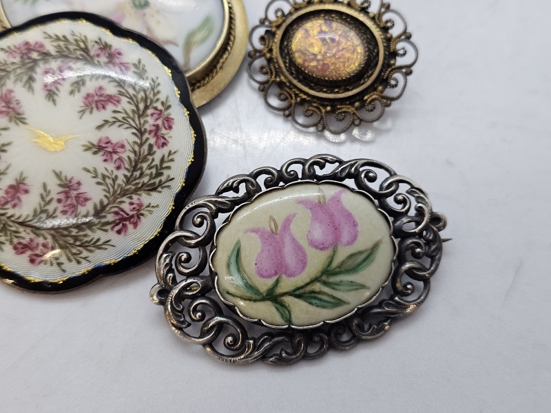 #1412 Kauniita hopeisia rintakoruja: Mm. Emalikoristeella, signeerattu posliininen