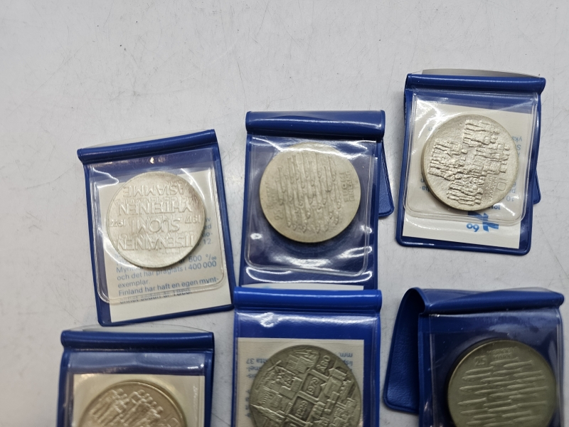 #1551 - 9kpl hopeisia juhlarahoja: Turku, Kalevala ja Suomi 60v, 500h, 212g