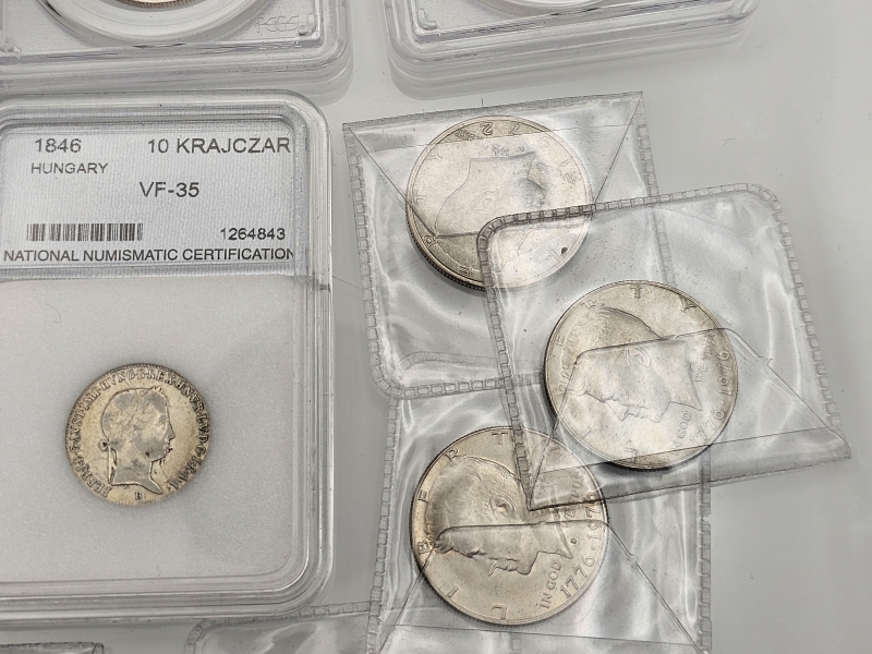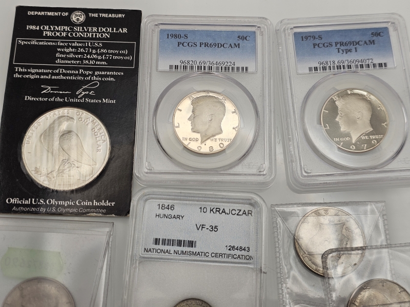 #1580 Hopeinen 10 Krajczar 1846 + hop. 1980 olympiaraha + Kennedy -kolikoita