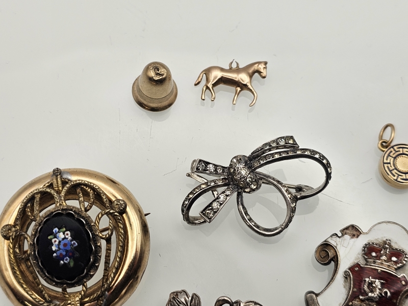 #1584 Erä koruja ja merkkejä joista osa hopeaa ja "kello" 9k kultaa [1,11g]