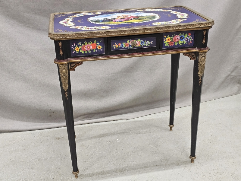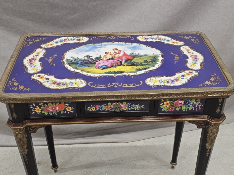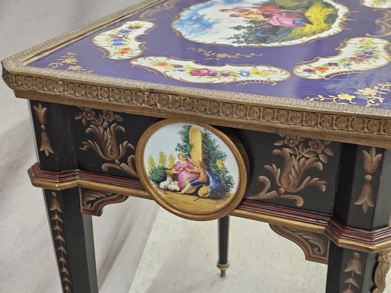 #1953 Kauniisti koristeltu Napoleon III -tyylinen pöytä posliinipinnalla ja -koristeilla sekä messinkilyötteillä