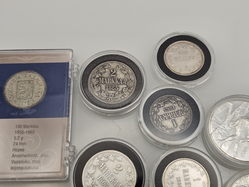 #1538 - Hopeisia juhlarahoja ja vanhoja hopeisia markka-kolikoita + ei-hopeinen juhlaraha