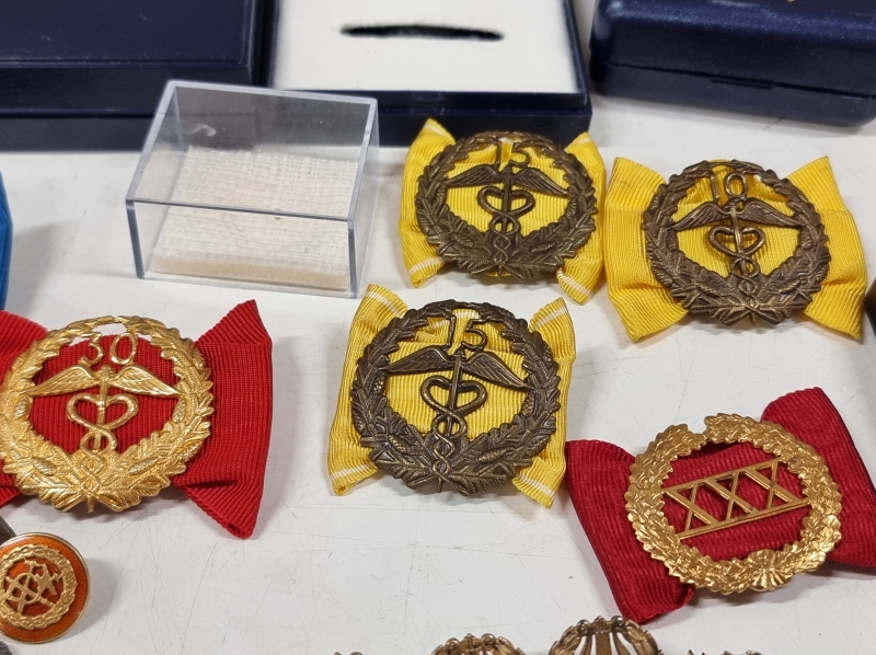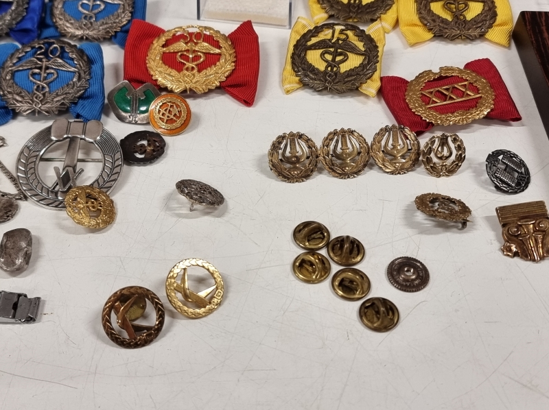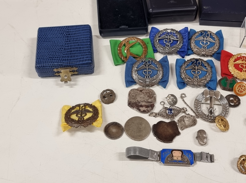 #1585 Hopeisia rintamerkkejä, rannekoru ym. Kaikki merkit eivät ole hopeaa.