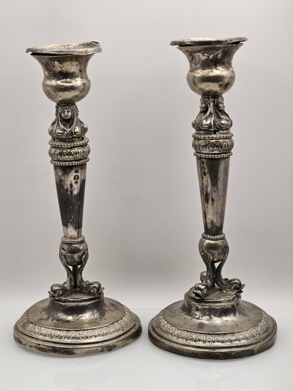 #1546 Hopeiset empire -kynttilänjalat, 1800-luvun alku, 544g