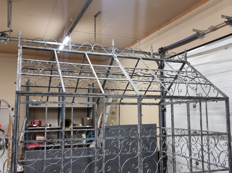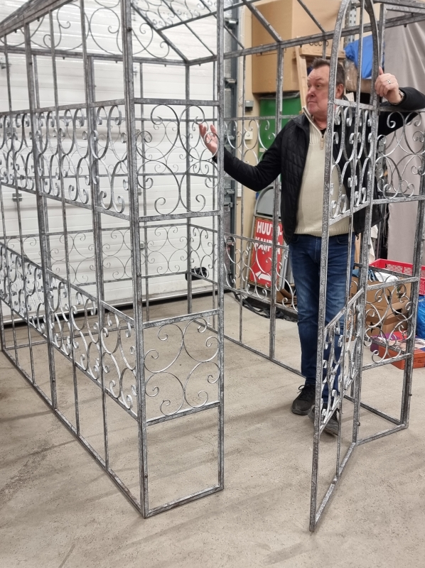 160 cm x 245cm, korkeus koristeen kanssa 297cm. Helppo purkaa ja kasata.