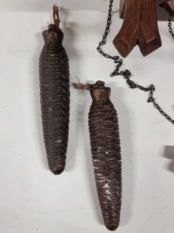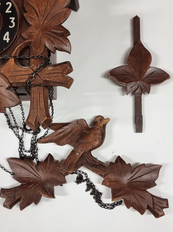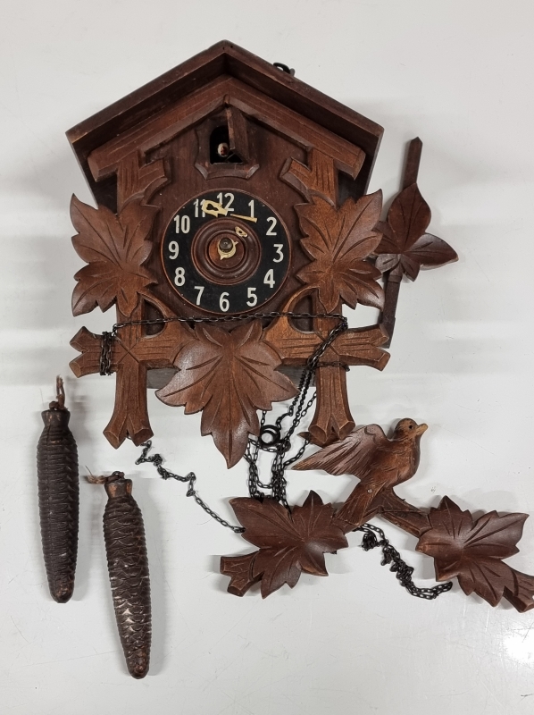 Kellon viisarit poikki, mutta käki kukkuu. Puntarin H: 18,5cm