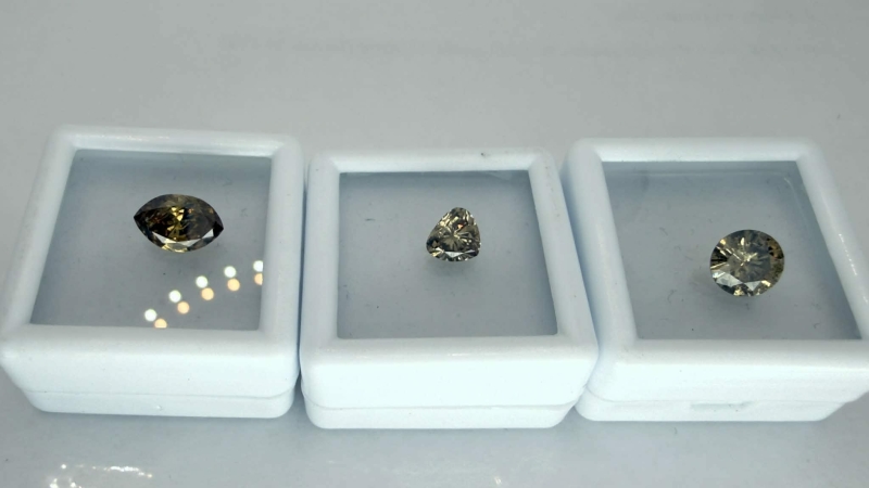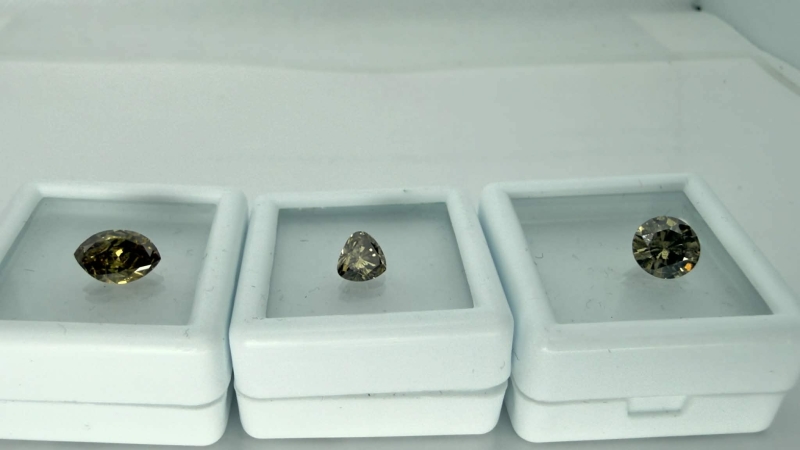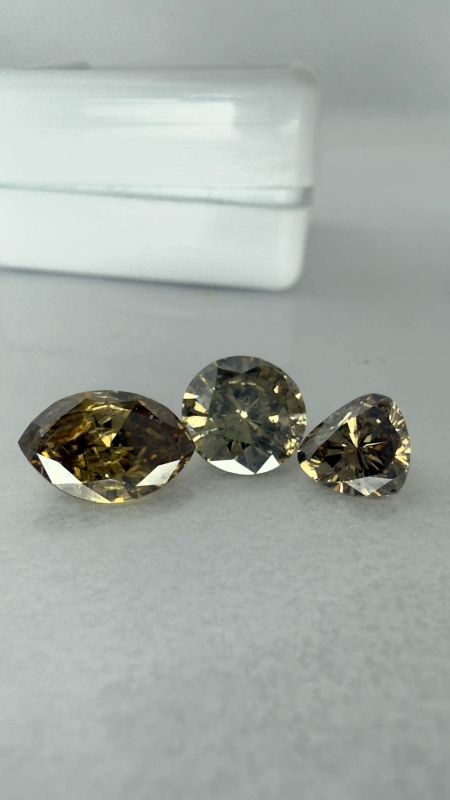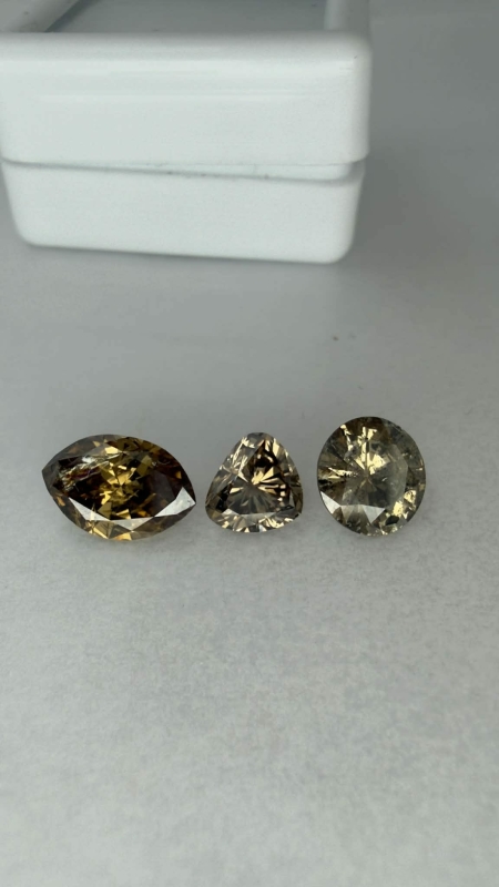 #1628 3kpl timantteja: 1,24ct light yellow brown Navette / 1,11ct Brown Round Brilliant / 0,71ct light yellow brown Triangle + todistukset