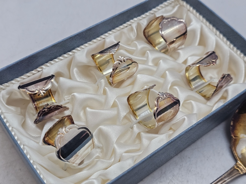 #945 - Hopeisia chippendale servettirenkaita, haarukka ja lusikka, 830h, 84g