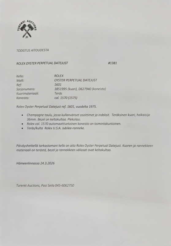 Mukana laatikko ja aitoustodistus ym. Halk: 36mm. Ref: 1601