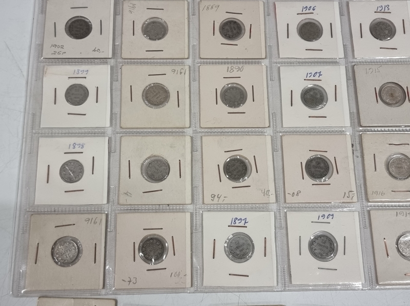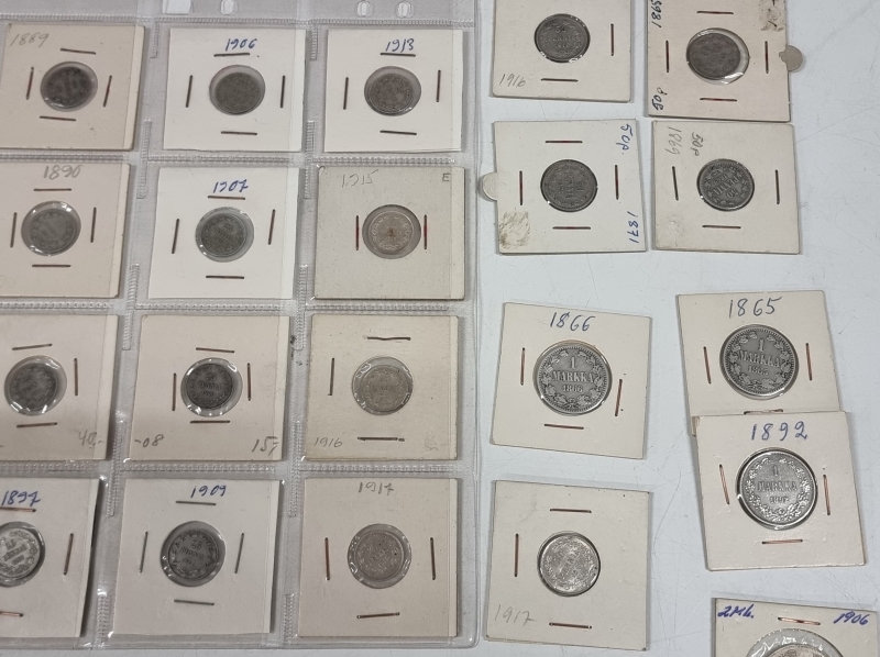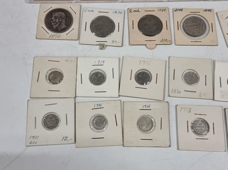 #980 - Hyvä erä hopeakolikoita: 1 rupla 1898, 2 mk 1870, 1 mk 1865 ym. 500-900h