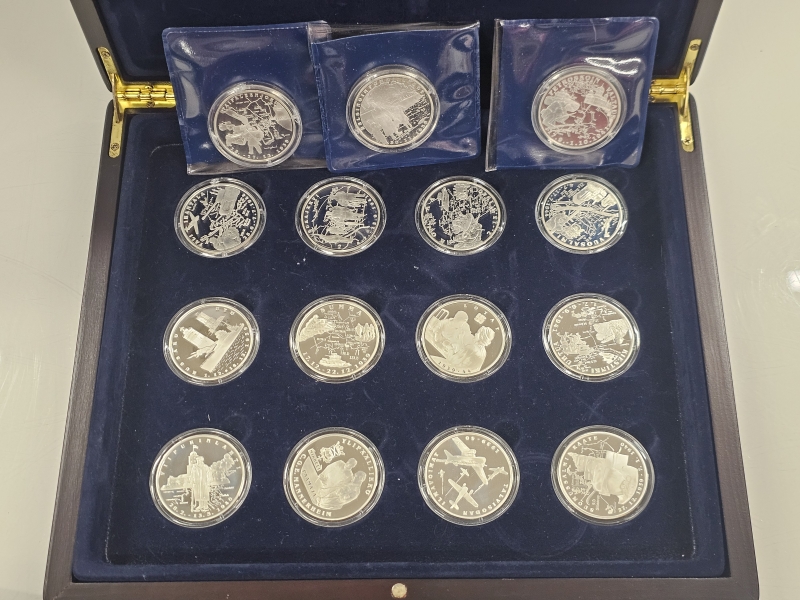 #964 - 15kpl hopeisia Suomi taisteli 1939-45 mitaleita, 925h, 390g