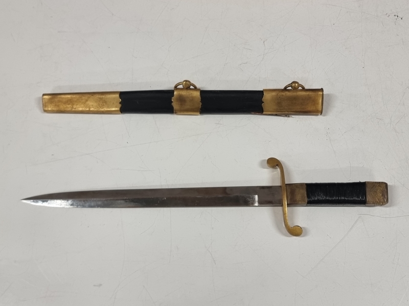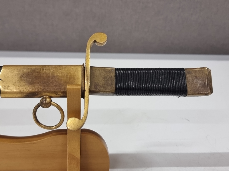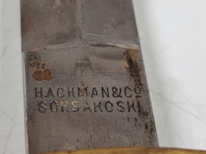 Kahvassa korjauksia: Punokset eivät alkuperäiset, kahvan nuppi puuttuu. Tupen nahkaosa korvattu puulla. Pituus 36cm